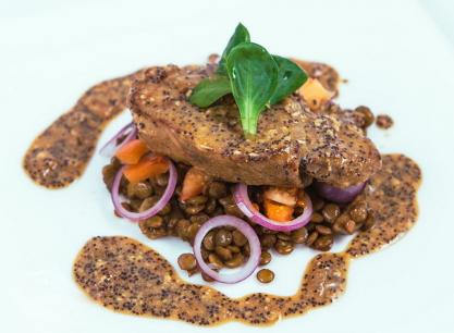 2.Чечевицу отварить с тимьяном и ложкой оливкового масла. Затем немного обжарить гарнир с рублеными луком и чесноком.