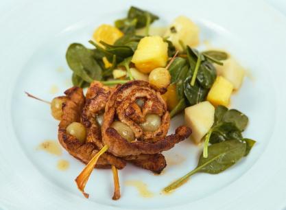 3.Для гарнира нарезать очищенные фрукты кубиками, добавить шпинат и заправить салат соком лимона с оливковым маслом и листочками розмарина. Приправить по вкусу.